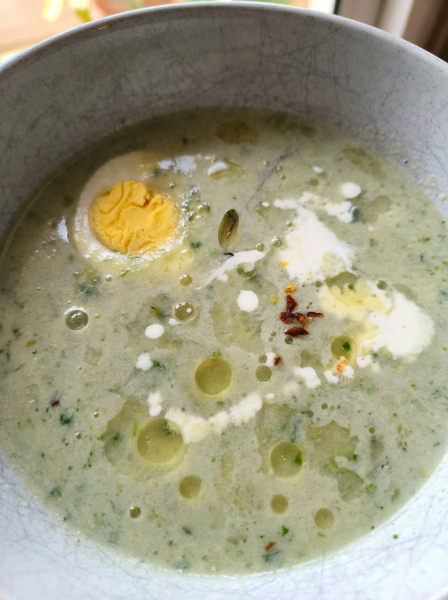 Step 10: Pour into bowl. Add the lemon juice, a drizzle of olive oil, a drizzle of cream for a splash of color, some red pepper flakes and a halved boiled egg.
